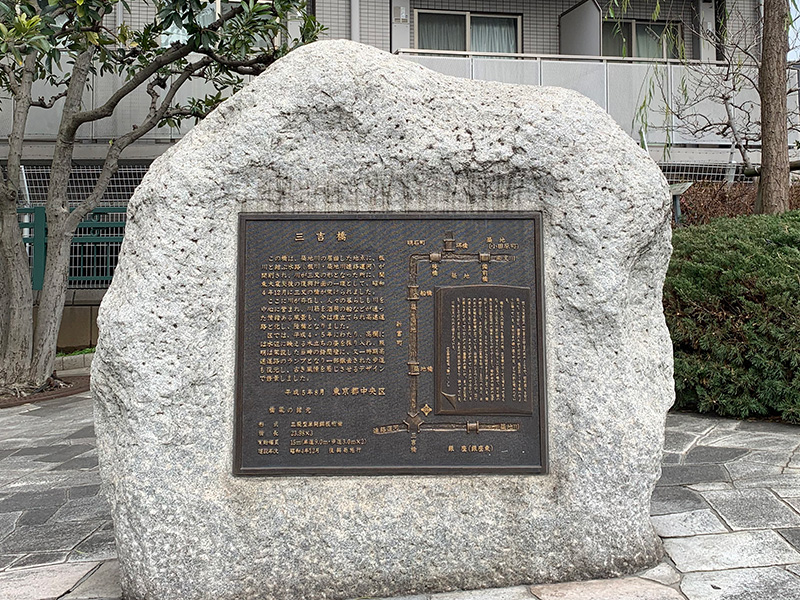 「三吉橋」の手前には石碑が。石碑を読むと「この橋は、築地川の屈曲した地点に、楓川と結ぶ水路(楓川・築地川連絡運河)が開削され、川が三叉の形となった所に、関東大震災後の復興計画の一環として、昭和4年12月に三叉の橋が架けられました。(原文まま)」