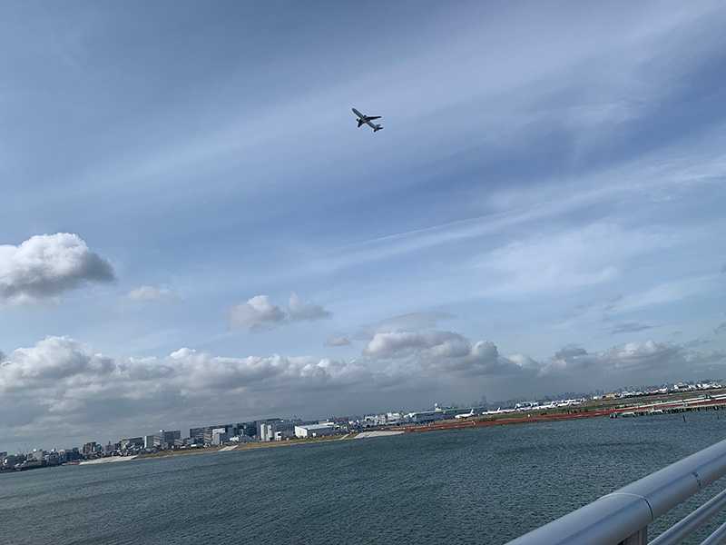 何が見ものかって川崎市側から大田区を目指せば、羽田空港と各地に飛び立つ飛行機を間近で見れることだろう。たいていは飛行機の“腹“しか見えないものだが、天気と目さえよければ脇腹のデザインまで見えるし目的地によってルートが違うから「あの飛行機はどこに行くんだろう」「さっきの飛行機とは違う場所にいくんだね」なんてぼ~っと眺めているだけで心はすでに空を飛び飛行機にのって旅にもでているようでもある。