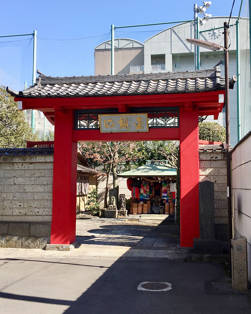 路地奥に見える大円寺の門、神社の鳥居にも見える日光御成道との追分で右折すると、車通りが少なめになり、中山道は静かになった。