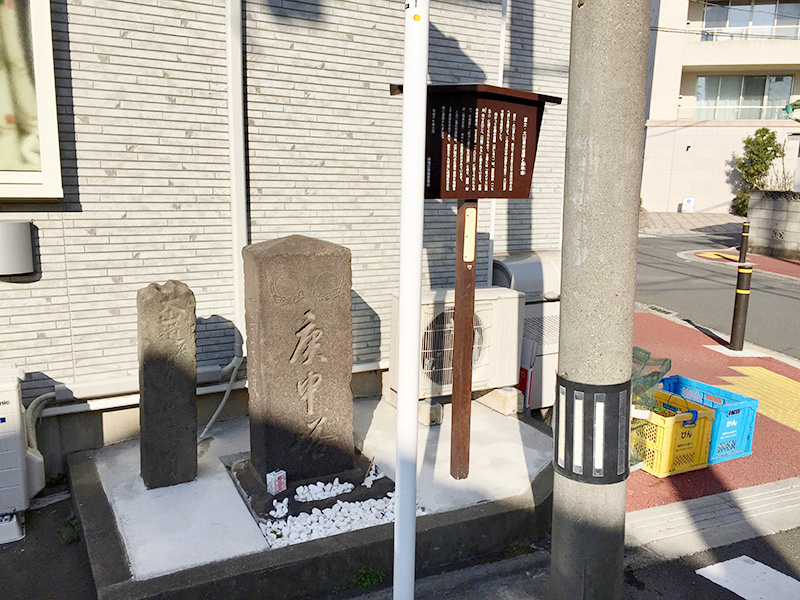 住宅地を歩いていくと、ある区画のゴミ収集所になっている角に、石の道標と庚申塔、そして説明版が、電信柱の後ろに隠れるようにあるのを見つけた。
