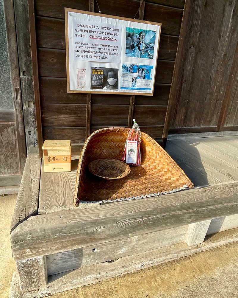 趣旨に賛同する里の人々がこの藤箕の中に野菜を置き、その野菜を持って行く人がブリキ缶に心付けを入れていくのだ。