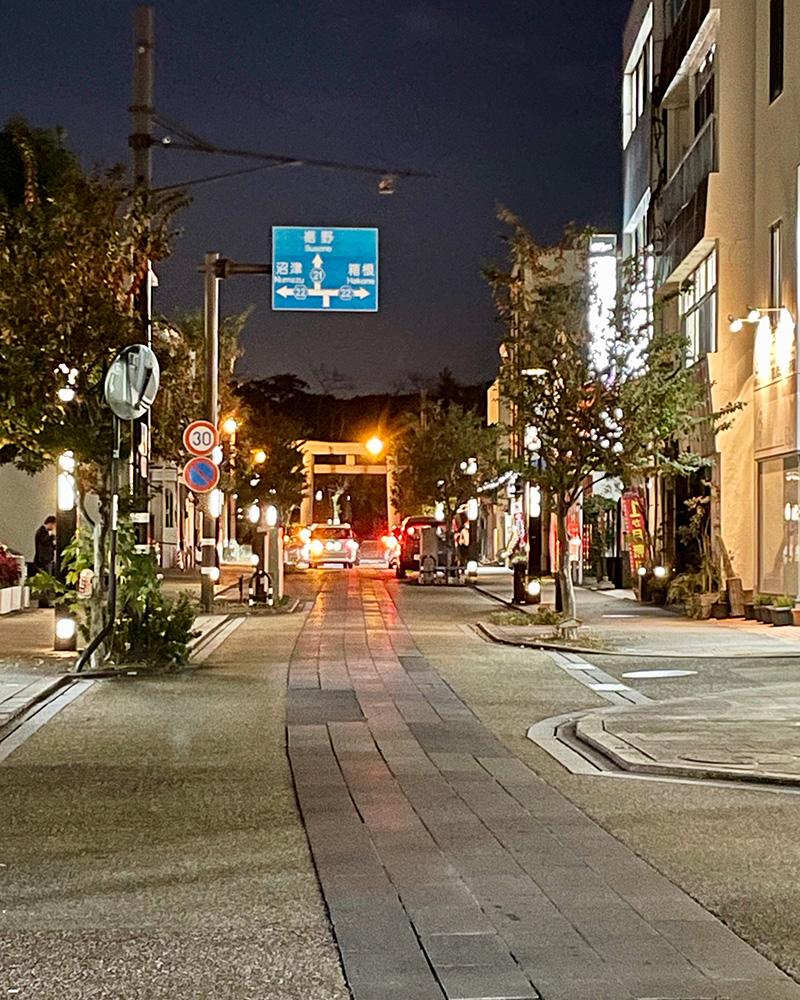 つきあたりに、伊豆国一ノ宮・三嶋大社の鳥居が、信号機に照らされて輝いている。
