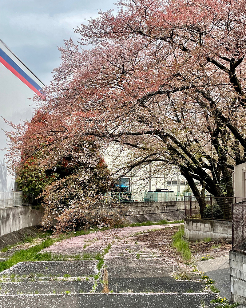 桜の花びらが風に舞い、通りをピンクに染めている。