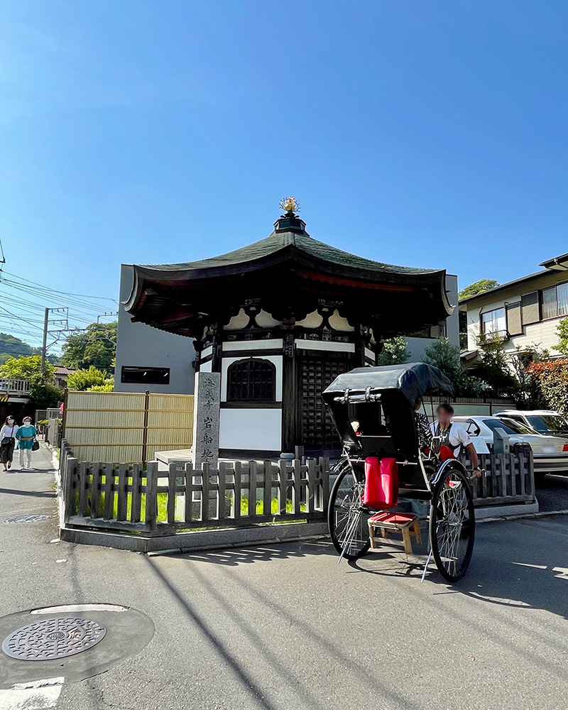 静寂に満ちた鎌倉仏教のお寺の前には、人力車を引いて行き交う真っ黒に日焼けした青年たち。