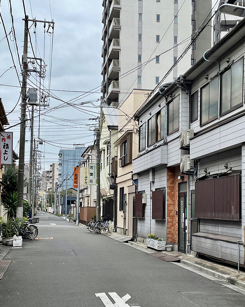 仲見世通りの裏道まだ朝早いのか、仲見世通りのお店のシャッターはほとんどが閉まり、一軒だけ開いていた人形焼のお店で、カタカタ、カッチャンと菓子を焼き上げる機械がまわっている。